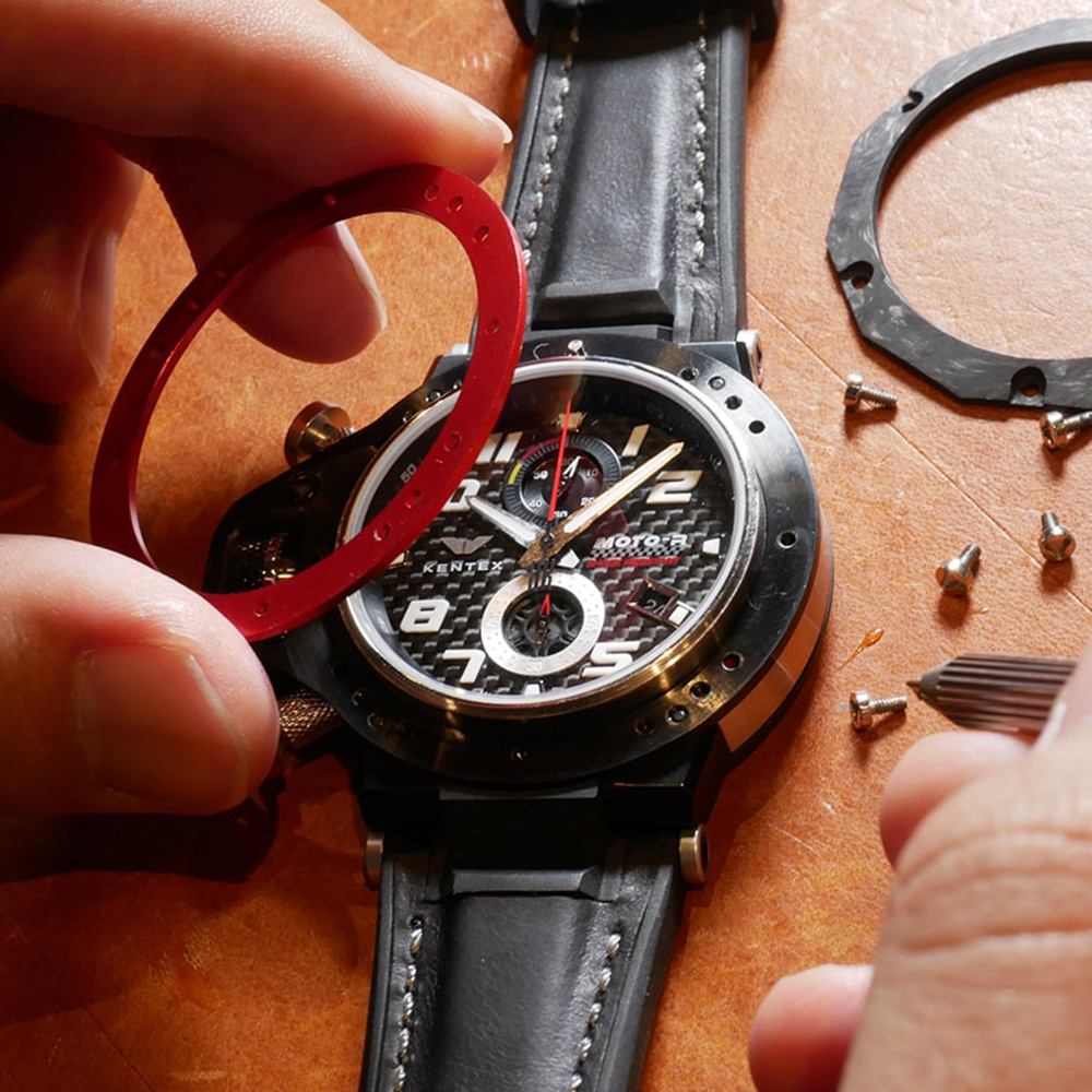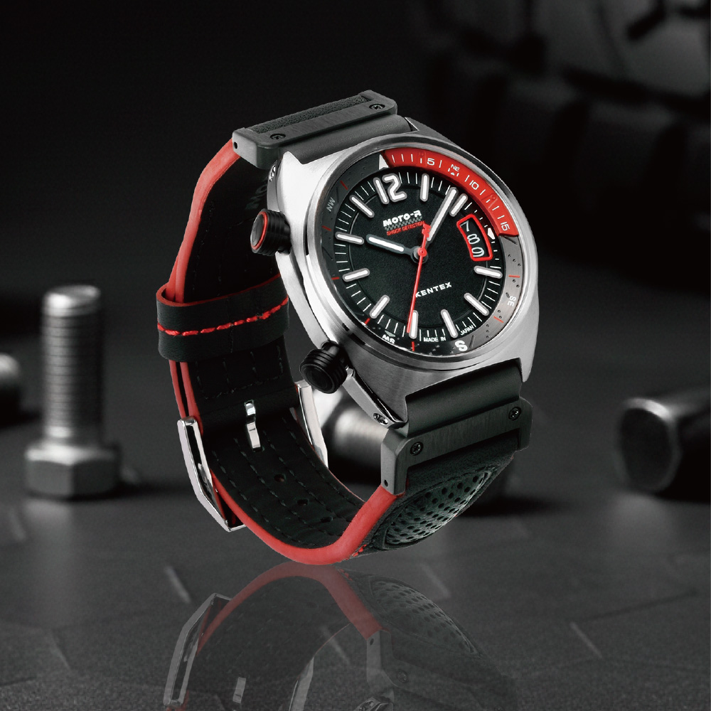 ハンドル操作を妨げない逆位置リューズや耐震ムーブメントを搭載するなど、ライダー目線での高い実用性と、メカニカルで素材感あふれるスポーティーなデザインが特徴です。